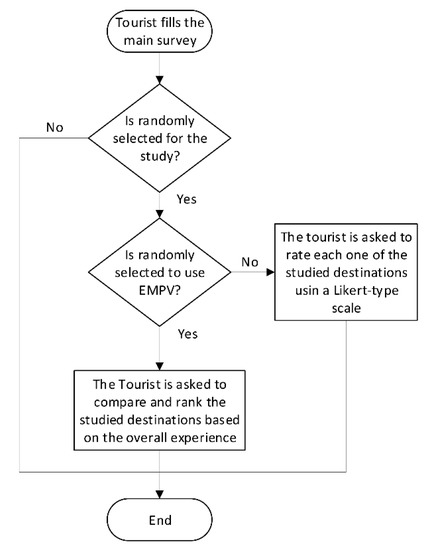 Subjects that were randomly selected for this study were asked to answer one of two additional questions following the decision pattern shown in Figure 2. Using a simple pseudo-random number generation algorithm, the survey system determined if the current subject would be included in the study or not; if included, the system decided whether the subject would be asked to compare and rank the studied destinations (EMPV approach) or to rate each destination using a 7-point Likert-type scale. The Likert-type scale ranged from completely dissatisfied to completely satisfied (Table 7) [36,37,38]. The subjects were only asked to evaluate the cities that they already visited, leaving the other alternatives in blank.