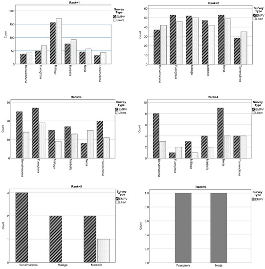 One of the goals of this stage of the TPCS survey was to rate the experiences of travellers in their destination of choice of the Costa del Sol. In this regard, this study explored the possibility of using the EMPV procedure to create a ranking of the destinations that tourists visited during their stay. To do so, a subsets of tourist was randomly sampled to answer an additional question designed to rate the overall experience in the cities of Marbella, Nerja, Torremolinos, Benalmádena, Fuengirola, or Málaga, as these destinations account for more than the 60% of the tourist-related income of the Costa del Sol region [35]. Tourists that visited less than two of the selected destinations were excluded from the study.