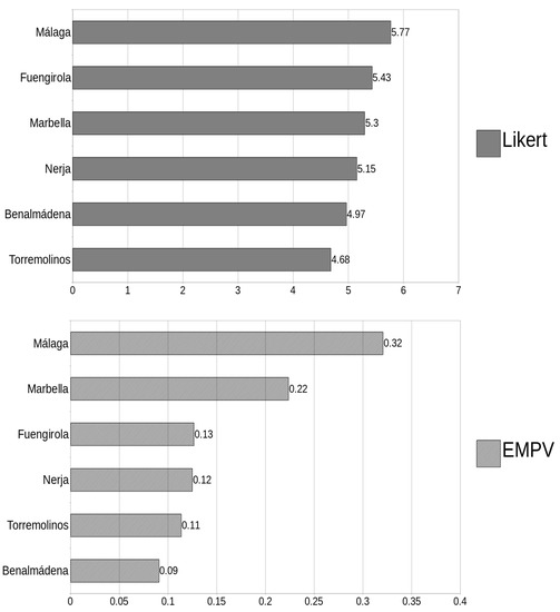 The findings of the research design were analysed to determine the aggregated preferred destinations between six cities of the Costa del Sol region. The city of Málaga was ranked first for both the EMPV and Likert-based approaches. The consensus in the first position indicates a dominant preference where most of the decision-makers chose Málaga before all the other alternatives. It is important to notice that the city of Málaga is the capital of the province of Málaga and is the largest city in the Costa del Sol region.