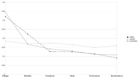 On the other hand, the EMPV approach resulted in the following scores: Málaga = 0.3206, Marbella = 0.2236, Fuengirola = 0.1265, Nerja = 0.1249, Torremolinos = 0.1136, Benalmádena = 0.0908. Therefore, the EMPV ranking of destinations is: