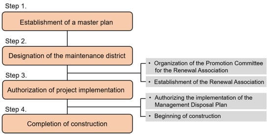 Four steps of the urban renewal project. Source: The Act on the Improvement of Urban Areas and Residential Environments [10].