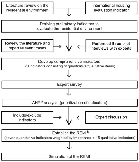 Flowchart of the research process. Notes: a AHP, analytic hierarchy process; b REMI, Residential Environment Maintenance Index. Source: Authors’ work.