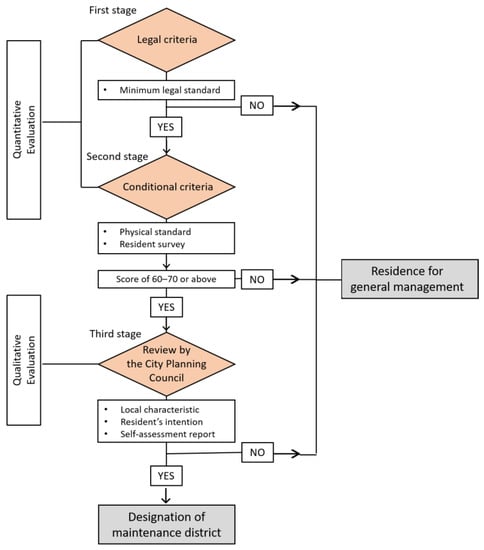 In the second stage, the districts that pass the first stage of legal criteria are scored and evaluated. In this stage, conditional criteria are evaluated on the basis of seven quantitative indices. The evaluation of indices such as residents’ consent, building deterioration criteria, undersized parcel ratio, road length, and housing density is based on a total of 100 points. Additional points are awarded once a high rate of survey respondents is identified, and points are deducted according to the increase in the proportion of new buildings. In total, an area with more than 60–70 points can proceed with the request for maintenance district designation. Areas with conditional scores of 60–70 or more are required to develop a maintenance plan and request processing deliberation from the City Planning Council.