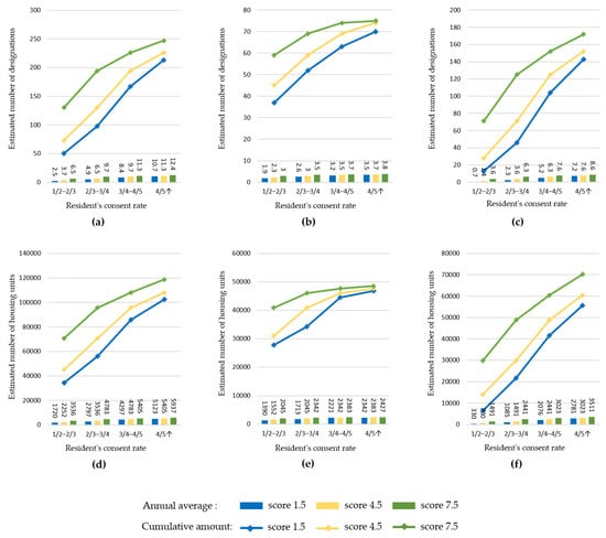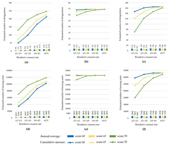 Further, changes in the number of designated areas and housing units according to the residents’ consent rate can be identified using the cumulative amount and annual average value. The cumulative amount refers to the total number of districts and housing units that are designated by 2030, and the annual average is the total number of districts and housing units divided by the number of years remaining till 2030.