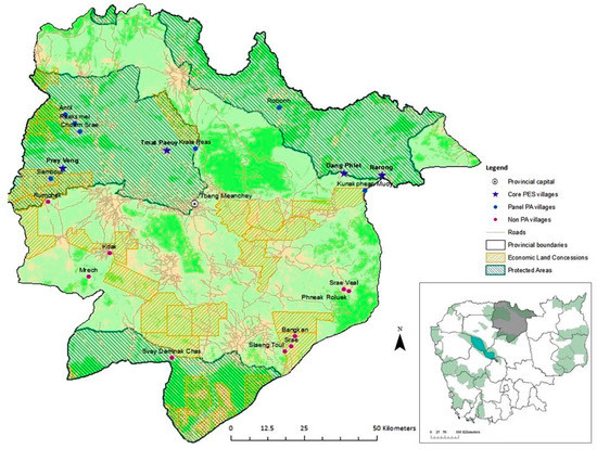 Quantitative data were collected as part of a wider impact evaluation which surveyed 1129 households across 20 villages in the province of Preah Vihear between July and December 2014 [52]. The survey design for data collection builds on a historical dataset of 11 PA villages and 9 counterfactual villages selected through co-variate matching using four key factors characterizing village-level poverty prior to the initiation of the PAs at a 2005 baseline [40]. Five counterfactual villages located at least 20 km away from the PA border were retained for the purpose of a multi-period impact evaluation of objective well-being indicators [53]. The 2014 data collection added four new villages that were among the matched results from the original quasi-experimental design, but that had not been surveyed in 2008 and 2011. These villages, Rumchek, Bangkan, Srae and Slaeng Toul, were added in 2014 because of the presence of ELCs close to their village, thus providing an interesting contrast against which to assess the influence of conservation.