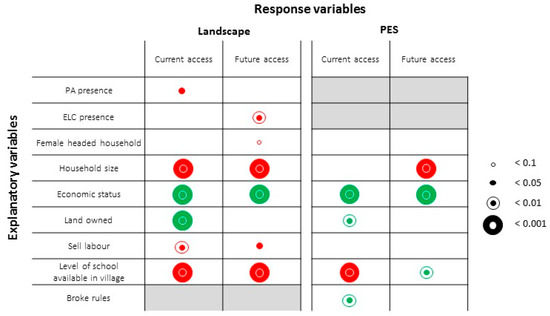Factors influencing perceptions of current and future access to land across the landscape (20 villages) and the core PES villages (4 villages). Results are based on the ordinal regressions of five level response variables of agreement to Likert-type item statements (see Appendix B for full results). The legend illustrates size of symbols corresponding to coefficients’ p-values; green symbols indicate a positive correlation to response while red symbols indicate a negative correlation to response.