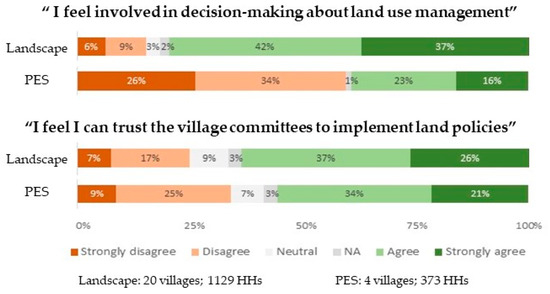 Perceptions of respondents on participation and trust in land management across the full dataset, and the core PES villages.