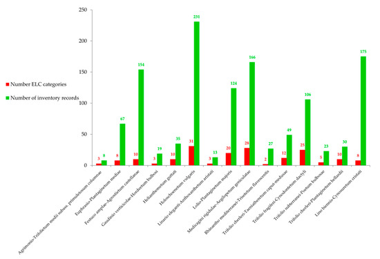 The clustering algorithm using the selected environmental variables resulted in an ELC map with 49 different ELC categories. The total number of inventories of the selected associations was 1283, distributed across 39 ELC categories. Inventories found to be in ELC categories ‘0′ or ‘NA’ (no available information) were excluded from the analysis, which resulted in 1227 total inventories. The distribution of the inventories of the associations along the ELC categories depended on the frequency of the ELC categories in the territory and the sampling effort (Table S3). The associations that were found in a greater number of ELC categories were Holoschoenetum vulgaris and Medicagini rigidulae-Aegilopetum geniculatae, which also had the highest number of inventories. On the other hand, two other associations (Lino biennis-Cynosuretum cristati and Festuco amplae-Agrostietum castellanae) with a similar sampling effort had a low number of ELC categories, which relate to more specific-habitat requirements (Figure 1).