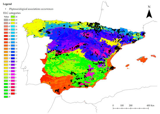An Ecogeographical Land Characterization map was created using the ELCmap tool of Capfitogen software v. 2.0 [25]. Its extent was restricted to Peninsular Spain and the Balearic Islands because none of the selected associations were found in the Canary Islands. The kmeanbasic function was used to define the optimal number of ELC categories for the ELC map. This function uses a clustering algorithm determining the cut-off points based on the decrease in the sum of the intra-group squares. When the decrease in the intra-group sum of squares in a range of n and n + 1 groups is less than 50%, the algorithm reaches the optimal number of categories [26]. It has been successfully used for the creation of other ELC maps, as described in Reference [17]. The territory was structured using a grid of 1 × 1 km cells. The ecogeographical variables used to create the ELC map were: (i) climatic variables: annual mean temperature, annual precipitation, temperature seasonality, temperature annual range, (ii) geophysic variables: elevation, slope degrees, (iii) soil variables: topsoil clay fraction, topsoil salinity, topsoil sodicity, topsoil organic carbon, topsoil pH, topsoil sand fraction, topsoil slit fraction, and (iv) other variables: latitude and longitude, which were included to create spatially aggregated categories. All these variables were chosen, in agreement with expert advice, to consider relevant ecogeographical factors in species distribution, which aim to create a generalist ELC map that would discriminate different adaptive environments for species with diverse ecological requirements.