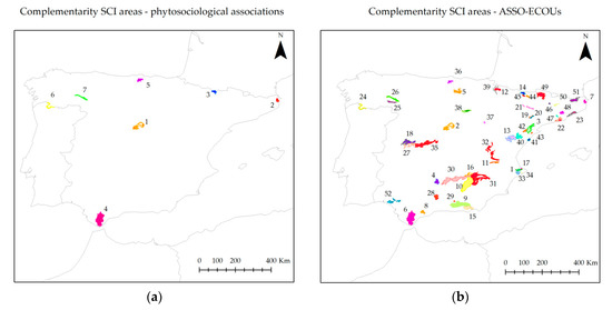 Graphic comparison between the seven Sites of Community Importance (SCI) areas needed to conserve the 15 phytosociological associations (a) vs. the 52 SCI areas needed to conserve the 114 Asso-EcoUs (combination of associations with ecogeographical categories) under study (b). The selection of areas was made through complementarity analysis and numbers by the SCI areas indicate the ranking in the selection process.