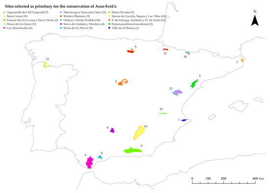 The complementarity analysis showed that seven SCI areas (0.48% of the network) would be needed to conserve all 15 associations. In addition, these seven areas would contain 22 different Asso-EcoUs (17.5% of Asso-EcoUs inside SCI areas) (Table 2). Same analysis performed with the 114 Asso-EcoUs showed that 52 SCI areas (3.59% of the network) is the minimum number of areas to represent Asso-EcoU at least once each (Table S7). Figure 3 shows the maps representing the SCI areas obtained from complementarity analysis targeting the associations or the Asso-EcoUs. Fourteen SCI areas add at least three new different Asso-EcoUs to the sites selected through complementarity analysis, which represents around 41% of total Asso-EcoUs (67 different Asso-EcoUs) and 14 of the 15 associations. To complete the coverage of the associations and include the missing association, (Linario eleganti-Anthoxanthetum aristati). The SCI area named Baixa Limia must be added since it is the only one including that association (see Table S4). These 15 areas constitute our proposal for establishing genetic reserves of phytosociological associations containing prioritized forage and fodder CWR of Spain (Figure 4). This proposal includes all the targeted associations and 41% of the targeted Asso-EcoUs (68 different Asso-EcoUs). Both results using the associations or the Asso-EcoUs point at a high effectiveness of the network in covering our target conservation units.