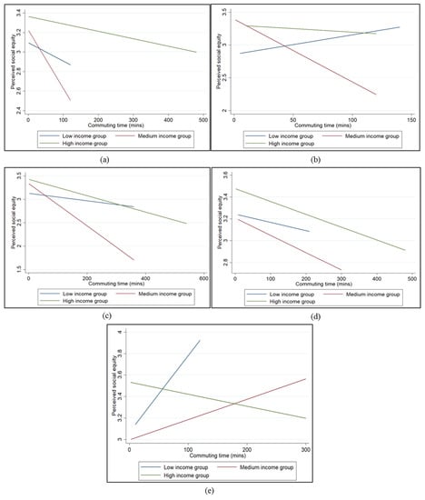 The relationship between commuting time and perceived social equity across modes of transport: (a) commuting via walking; (b) commuting via bicycle; (c) commuting via motorcycle; (d) commuting via public transport; (e) commuting via private car.