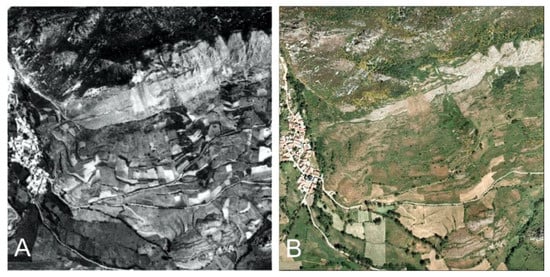The fundamental tools used to carry out the cartography of the vegetation were orthophotography (for 2008) and georeferenced aerial photography (for 1957) (Figure 2). The orthophotographs derive from the summer photogrammetric flight carried out within the framework of the National Aerial Orthophotographic Plan (PNOA), in .ecw (enhanced compression wavelet) format. Each orthophotograph corresponds to a raster of 14,240 columns and 10,040 rows, with a cell size of 0.25 × 0.25 and a pixel depth of 8 Bits, which encompasses approximately 3.28 × 2.51 km2. The aerial photographs used to analyze the earlier landscape derive from digitalized stills from a flight in 1957, not ortho-corrected, saved in Geotiff format, with 6780 × 6071 pixels, 600 ppp, and 8 Bits of depth, held in the cartographic archives of the Duero Hydrographic Confederation [30].
