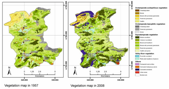 The results obtained from the temporal indices calculated for the case study suggest a change in the plant landscape of the territory in the direction of a higher maturity status, as is evident in Figure 4. The basis of this change is explained and accounted for by analyzing and interpreting the vegetation cartography. The most significant changes detected between 1957 and 2008, and which are likely to be relevant to the result obtained in the indices, were as follows: