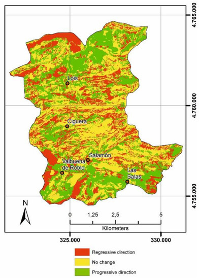 A final map of variation in the conservation status of vegetation in the studied time period is shown in Figure 4. The land cover change data are shown in Table 6. In the entire territory studied, the percentage of vegetation cover in which no changes occurred was 39.62%; 35.85% of the territory advanced towards a climax state (progressive direction), while 24.53% moved away from the climax state (regressive direction).