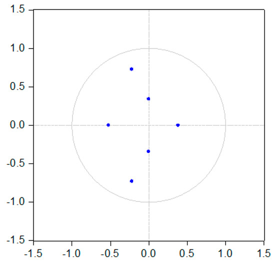 Figure 1 shows that the eigenvalues of the model remain within the unit circle. This indicates that the VAR model is stationary. In a more detailed interpretation of the variables in the VAR model, impulse–response graphs should be examined. With the help of these functions of VAR models, the effect of a standard error shock on another variable can be seen. Impulse–response graphs are stated in Appendix A. While evaluating these graphs, it is identified that economic growth and industrial production give significant responses to the changes in electricity production.