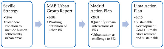 Designating urban areas as BRs (i.e., “urban biospheres”) has been viewed as a step-change in conceptualizing the BR designation [17,25]. The definition of an “urban biosphere” has been debated for many years by UNESCO [7,18], who established the MAB Urban Group in 1998 to study the the application of the BR principle to ‘urban areas and their hinterlands’ [7,29]. This Group published a working definition: