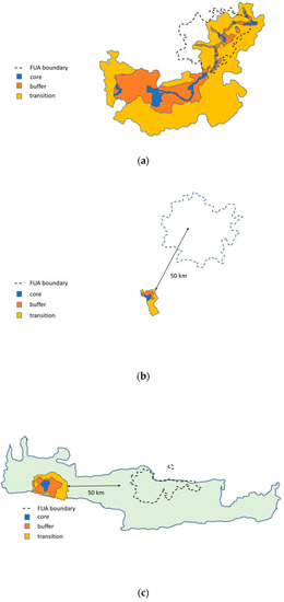 Examples of biosphere zones—core, buffer, and transition—and the spatial relationships between BRs, FUAs, and the “zone of influence” are illustrated below (Figure 2a–c) using three BRs included in this study: Collina Po BR, Italy; Babia Gora BR, Poland; and Gorge of Samaria BR, Greece.