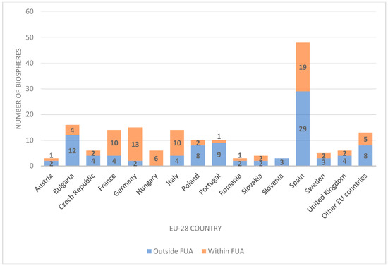 Number of UNESCO Biosphere Reserves (BRs) in EU-28 countries. The nine countries which have only one or two BRs are grouped under “Other EU countries”. Transboundary reserves were counted for each country that they occur within. The blue bars indicate the number of BRs outside Functional Urban Areas (FUAs) and the orange bars indicate the number of BRs within an FUA.
