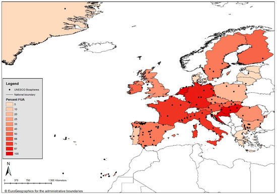 Percentage of BRs that are located within a Functional Urban Area (FUA) as defined by the Urban Atlas [12] by country. The darker red the colour of the country is, the higher the percentage of urbanised BRs. Centroids of UNESCO Biosphere Reserves (BRs) in the EU-28 are shown. The EU-28 countries that do not have BRs at all were excluded (country boundaries are from Eurostat European Union, 1995–2018).