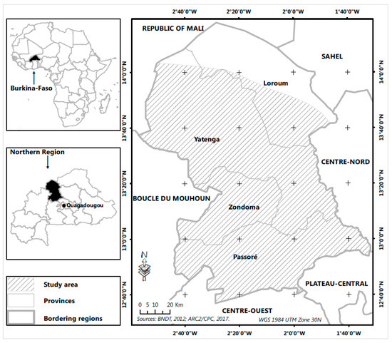 The study was carried out in Burkina-Faso, a West African country with predominantly Sahelian climatic conditions. The country is defined according to the average annual rainfall in three main climatic zones: the Sahelian climatic zone in the north (300–600 mm/year), the Sudanian climatic zone in the south (900–1200 mm/year), and the Sudano–Sahelian climatic zone in the centre (600–900 mm/year) [4]. The study area is located in the Sudano–Sahelian climatic zone of the Northern Region of the country (Figure 1). It is located between latitudes 12°38′ and 14°02′ N and longitudes 1°33′ and 2°55′ W, and covers an area of 13,950 km2. It includes the administrative provinces of Loroum, Passoré, Yatenga, and Zondoma.