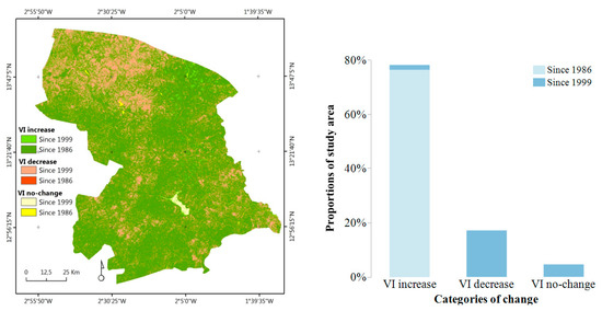 The Correspondence analysis shows that the sites with increasing vegetation index are opposed to those with decreasing and no-changed vegetation index by dimension 1, which explains 99% of total inertia (Figure 9b). The distribution of the modalities of the two variables shows that the increase in the vegetation index is more attached to agroforestry park but also to natural vegetation (steppes, savannah, riparian forest, or conserved area) (Figure 9b). The decrease and no-change of the vegetation index, on the other hand, is preferably observed on no-vegetation areas (habitation area, bare land, and water surface) (Figure 9b).