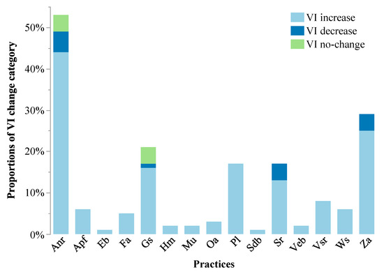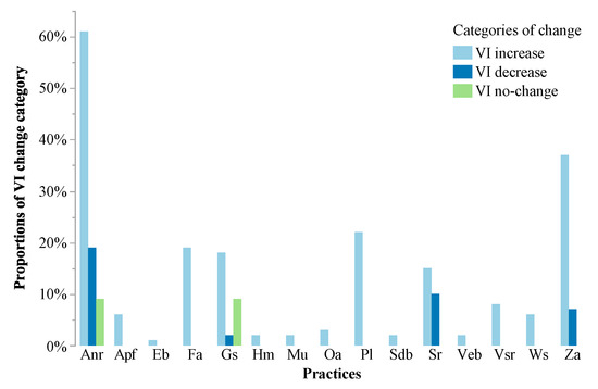 Frequencies of practices with high potential for woody plant regeneration by category of woody plant cover change. Anr: Assisted natural regeneration; Apf: Animal parking in the farm; Eb: Earth bund; Fa: Fallow; Gs: Grass strip; Hm: Half-moon; Mu: Mulching; Oa: Organic amendment; Pl: Planting; Sdb: Stones dyke barrier; Sr: Stones row; Veb: Vegetated earth bund; Vsr: Vegetated stones row; Ws: Woody strip; Za: Zaï.