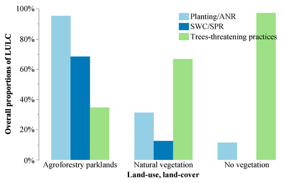 Frequencies of the groups of practices observed in the different land-use, land-cover (LULC) categories. Planting/Anr: Assisted natural regeneration, Planting, Fallow; SWC/SPR: Animal parking in the field, Earth bunds, Grass strips, Half-moons, Mulching, Organic amendments, Stones dyke barrier, Stones row, Vegetated earth bunds, Vegetated Stones row, Woody strips, Zaï; Trees-threatening practices: Agricultural expansion, Bush fires, Gold panning, Pasture, Urban development, Wood harvesting; Natural vegetation: Savannah, Steppe, Riparian forest, Conserved area; No-vegetation: Bare land, Habitation, Water surface.