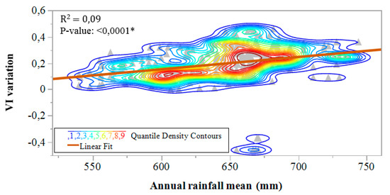 Relationship between spatial variation of vegetation index (VI) and the annual rainfall mean between 1986 and 2015.
