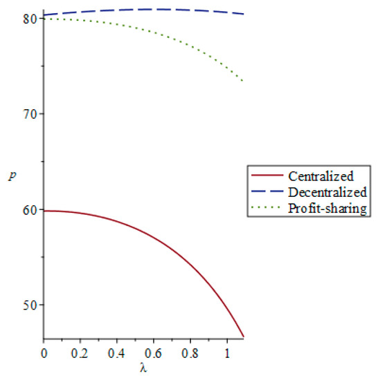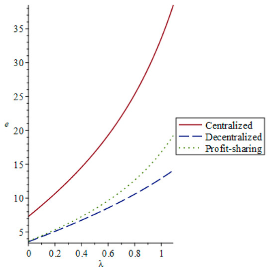 First, we analyzed the influence of the manufacturer’s environmental preference on the product’s greening level under three models: centralized decision making, decentralized decision making, and a revenue-sharing contract. As seen in Figure 1, the product greening level increased with the manufacturer’s environmental preference: . It could be concluded that the product’s greening level was the highest in centralized decision-making and the lowest in decentralized decision-making.