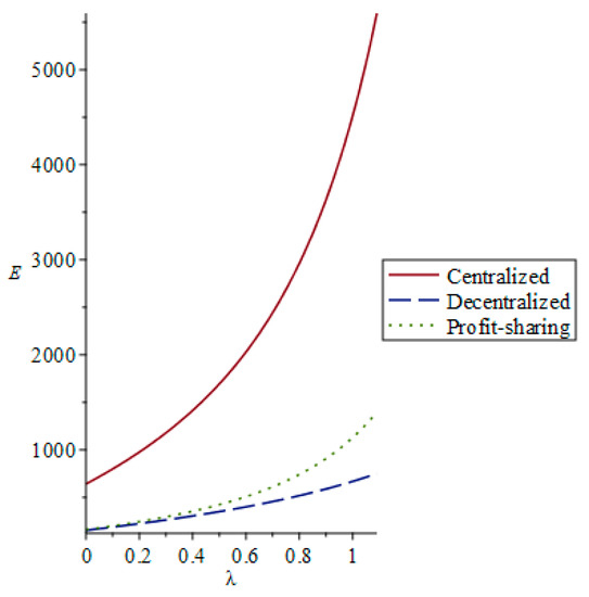 Second, we analyzed the influence of the manufacturer’s environmental preference on environmental benefits under the three models: centralized decision making, decentralized decision making, and a revenue-sharing contract. Figure 2 shows that the environmental benefits increased with the manufacturer’s environmental preference: . It also could be concluded that the environmental benefits were the highest in centralized decision-making and the lowest in decentralized decision-making. In addition, we also found that the revenue-sharing contract could coordinate the environmental benefits objective better, which was consistent with the above conclusion.