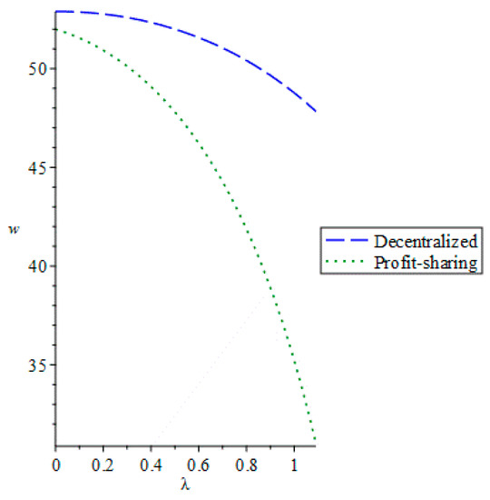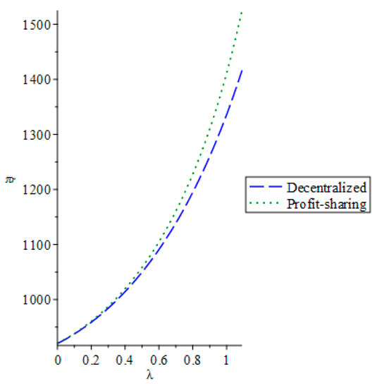 Third, we analyzed the influence of the manufacturer’s environmental preference on the wholesale price under a decentralized decision model and revenue-sharing contract model. Figure 3 shows that the wholesale price decreased with an increase of the manufacturer’s environmental preference, and the wholesale price under decentralized decision-making was higher than that under the revenue-sharing contract. Therefore, the manufacturer could make a profit by reducing the wholesale price under the revenue-sharing contract. Thus, the retailer could experience a higher profit return and coordinate the profit of the entire supply chain.