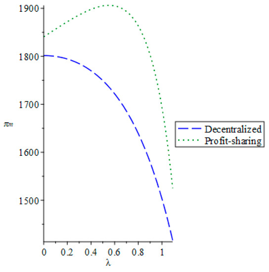 Fifth, we analyzed the influence of the manufacturer’s environmental preference on the manufacturer’s profit under a decentralized decision model and revenue-sharing contract model. Figure 5 shows that when the revenue-sharing contract was coordinated, the manufacturer’s profit first increased and then decreased with an increase of the manufacturer’s environmental preference, while its profit decreased with an increase of the manufacturer’s environmental preference when a decentralized decision was made. In addition, the manufacturer’s profit after coordination was higher. Thus, it could be concluded that the maximum profit existed under the revenue-sharing contract. The manufacturer would be more willing to consider environmental benefits as part of their decision-making goals when this condition was satisfied.