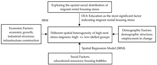 The conceptual framework of spatial heterogeneity of migrant rental housing pressure in China (Note: Ordinary least square is known as OLS, and spatial regression model is known as SRM).