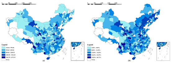 The rent–income ratio is a commonly used indicator to measure rental housing affordability [103]. As shown in Figure 2b, we divide the migrant rent–income ratio into five levels by using Jenks in ArcGIS (known as Jenks Natural Breaks Classification or Optimization). The high ratio (above 16.44 percent) indicates that the heavy rental housing stress is mainly distributed in the northeast, northwest, and southwest regions in mainland China. The migrant rent–income ratio in the southeast region is generally lower than that in north China, and the high rent–income ratio is mainly scattered in the particular provincial capital cities such as Fuzhou. It can be seen that the rent–income ratio is distributed continuously in the northeast and northwest regions in China. This distribution pattern of migrant rent–income ratios is almost consistent with China’s regional variance in terms of economic development patterns, where the growth path and regional gap across the southeast, northeast, and southwest regions in the mainland China is prominent and persisting over the years [104].