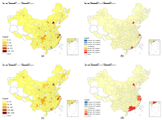 Spatiality of high-rent-stress migrants in urban China: (a) high-skilled migrants with high rent stress; (b) hot spot analysis of high-skilled high-rent-stress migrants; (c) low-skilled migrants with high rent stress; (d) hot spot analysis of low-skilled high-rent-stress migrants.