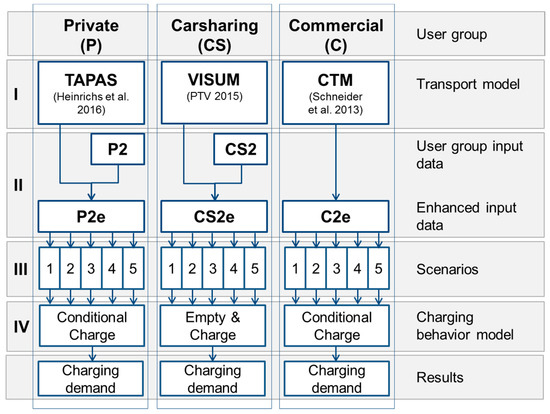 In the second step, further user group input data are determined from previous studies and existing empirical data sources to enhance data resulting from the transport models. This step allows assigning probabilities of using electric vehicles for each trip based on empiric data which is essential for the simulation. We do this for private and carsharing users.