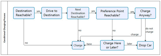 Figure 2 shows the decision-making process (“conditional charge”) implemented in the simulation. This process is divided into the decision before the trip and the decision after the trip. Before the trip, the simulation checks whether the intended trip can be completed. If the vehicle’s remaining SOC is insufficient, charging is documented (a virtual charge is started) and the trip is postponed until the battery charge level is sufficient to complete the trip. The model asks if a preferred charging point (e.g., private charging infrastructure) can be reached with the remaining range. If not, the parking duration and the achievable SOC are used to check which point within the further trip chain is best to charge at public infrastructure. Places where vehicles are parked for a longer time are more likely to be charging locations. Even if the next preference point is reachable, there is a low possibility of intermediate charging. On the basis of the parking duration and the remaining range, this probability is estimated.