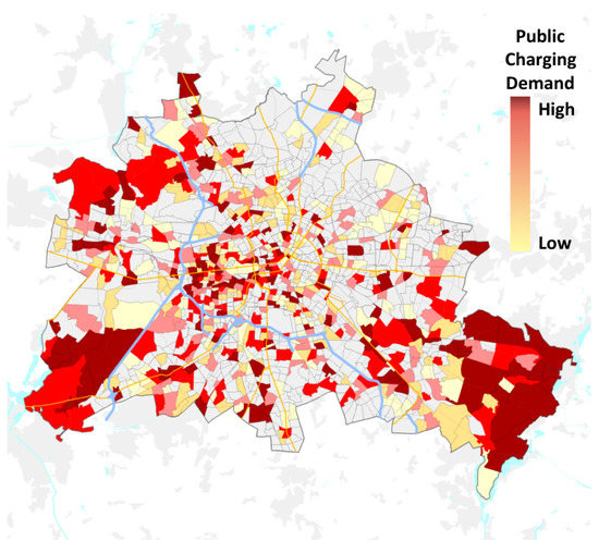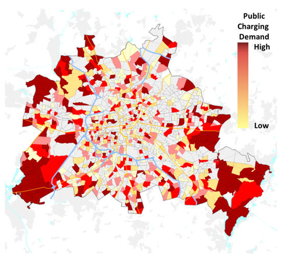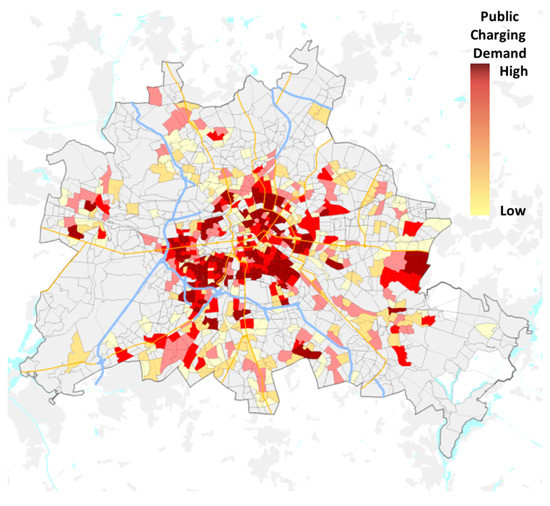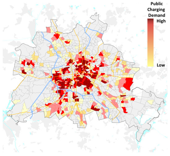 Next, the spatial distribution of public charging demand is determined for traffic districts in Berlin for the 15 pathways. Representative results are presented in the following paragraphs and figures.