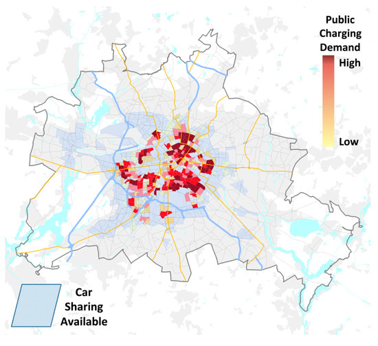 In order to illustrate our approach, we apply it to Berlin. This case study allows us to utilize data on electric vehicles, electric vehicle users, mobility behavior, urban structure, and other relevant factors. We select Berlin as the case study, due to the availability of detailed models (i.e., travel simulation models) and data (i.e., electric vehicle users, carsharing programs, carsharing user data). Furthermore, Berlin is one of Europe’s metropolitan areas with a dynamic market of flexible carsharing. The municipality of Berlin also supports electric vehicles and flexible carsharing through public charging infrastructure, which allows for the application of our approach.