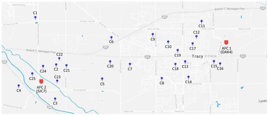 To validate the methodologies in this study and investigate the sustainability of UAV logistics, we present a realistic case study. Amazon is a leading company that actively tests and introduces UAV logistic services. Recently, Amazon revealed their new delivery drones and announced that their UAV delivery services will be implemented within months [52]. According to the description of their UAV delivery services, called Prime Air, UAVs take off from the Amazon Fulfillment Centers (AFCs) and provide delivery services to nearby customers. The case study deals with the actual Amazon AFCs and virtual nearby customers. Figure 1 graphically shows the two AFCs (OAK4 and SJC7) in Tracy, CA, USA and 25 customers (between 14:00 p.m. and 16:00 p.m.) near the AFCs. The Appendix A provides detailed descriptions for the locations (latitude and longitude), demand quantity, and time windows. With the same AFCs and customer information, delivery schedules of UAVs and GVs were obtained by phase I, respectively. The environmental effect of UAV logistic services is investigated in phase II. For the case study, we solve the mathematical model using CPLEX 12.4 on a personal computer with Intel i5-4460 CPU and 8 GB RAM.
