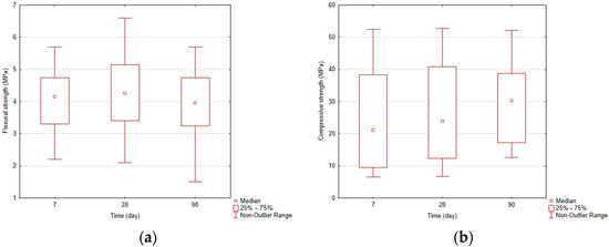 (a). Box plots—flexural strength. (b). Box plots—compressive strength.