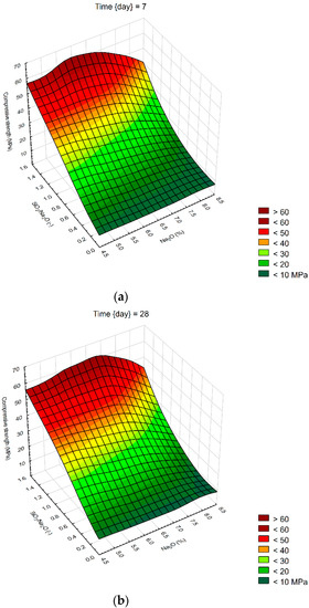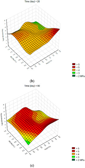 Surface charts of compressive strengths—(a) 7 days; (b) 28 days; (c) 90 days.