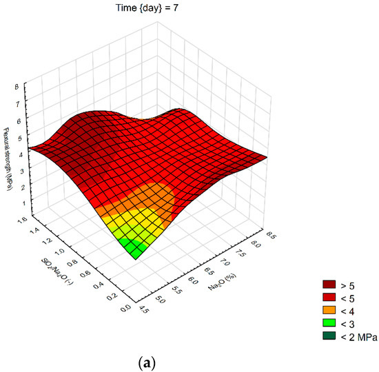 Surface charts of flexural strengths—(a) 7 days; (b) 28 days; (c) 90 days.