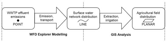 This research aims to trace TWW through the hydrological system of the Netherlands, with an emphasis on de facto reuse in agricultural systems; this therefore follows its release at WWTPs, transport and distribution among surface water bodies, and eventual extraction and application on agricultural fields (Figure 1). In this way, TWW propagates from a point source to a linear network to a planar distribution, becoming increasingly pervasive within the hydrological system. A national scale water quality model is used to simulate the partitioning of flow components within surface water bodies and the transport of TWW through the surface water network. Subsequently, a spatial analysis step is applied to relate the distribution of TWW in the surface water system to agricultural extractions for irrigation, hence identifying areas in which de facto reuse is occurring.