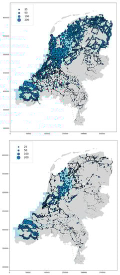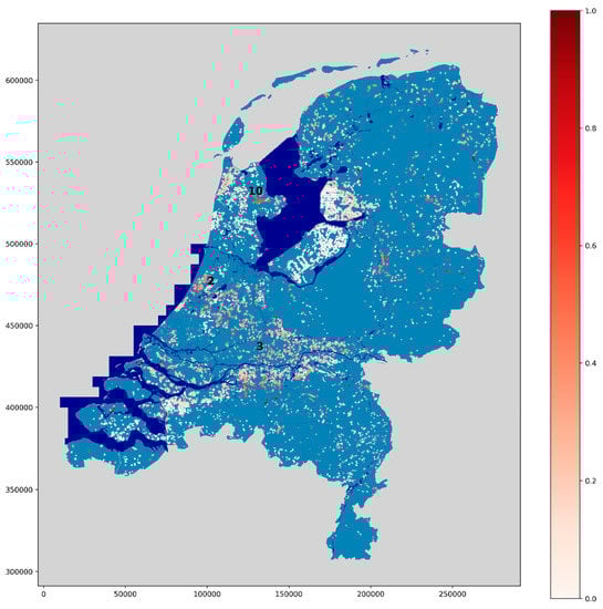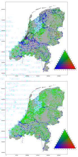 A key limitation to this study resides in the fact that it does not explicitly account for different irrigation practices. This is important, as the dominant form in the lower parts of the Netherlands is sub-surface irrigation using polder networks to supply water directly to the root zone [,]. A better representation of de facto reuse in agriculture would therefore identify inlets to polder networks from surface water bodies and attach this value to the entire polder area. Data on these inlet points, however, is only partially available through regional water boards; therefore, the steps taken in this study represent a best estimate based upon openly-available national scale datasets. It is likely that the inclusion of this effect would produce larger areas of impact, hence suggesting that estimates of the extent of de facto reuse hereby predicted are conservative.