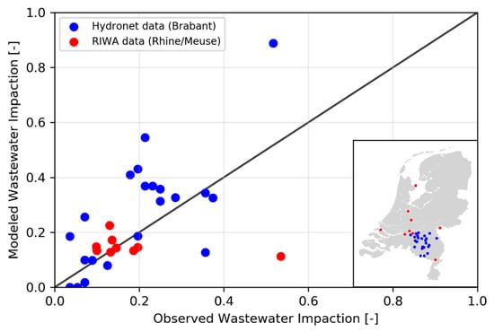 Model evaluation indicates that predictive accuracy varies, especially when considering higher predicted wastewater impactions (>40%), with two data points in particular showing large relative under- and over-predictions (Figure 4). This may be a result of increasing uncertainty in the model framework which occurs due to degradation processes being much more dynamic in real systems at relatively higher concentrations. A general trend toward overprediction is also shown in relation to the Hydronet data, which consists mostly of measurements taken in smaller streams. Overall, however, a fair level of agreement is shown, indicating that the model is useful for predicting the occurrence of TWW in surface water bodies. Moreover, when compared with the distribution of maximum CBZ concentrations in surface water bodies explored in a report by STOWA (2015), model outputs show good agreement (Appendix E). This finds elevated CBZ concentrations (above 0.5 [µg l−1]) in the same areas this study identifies as being highly impacted by TWW, notably in 5 samples taken from small streams in the east (Overijssel) and 3 samples taken from polder systems in the west (Zuid Holland area).