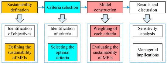 In recent decades, many researchers have evaluated the financial sustainability of MFIs [2,19]. Various criteria and mathematical models for doing so have been proposed in prior studies. According to the previous literature, there are three key points involved in evaluating the financial sustainability of MFIs: the sustainability definition of MFIs, the criteria, and the evaluating method, as shown in Figure 2.
