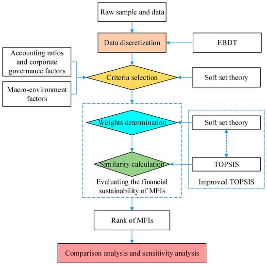 Using this framework, the main aim of this paper is to investigate the potential to construct a financial sustainability evaluation model for MFIs from a cross-country perspective. Such an analysis extends prior studies evaluating the financial sustainability of MFIs, adding a new cross-country perspective. Furthermore, it adopts a broad approach, covering many influencing factors on the financial sustainability of MFIs, instead of focusing only on accounting ratios and corporate governance factors. The cross-country focus enables the examination of the role of macro-environmental factors. Incorporating such information into the evaluation provides novel insights on how macro-environmental factors may influence the financial sustainability of MFIs. To address this issue, we also extend the research on MFIs by proposing a novel hybrid model of soft set theory and an improved TOPSIS (HMSIT). Soft set theory is adopted to select optimal criteria. The improved TOPSIS is proposed to evaluate and rank MFIs. For the improved TOPSIS, the weight of each criterion is allocated by soft set theory. This algorithm enables HMSIT to make full use of accounting ratios, corporate governance factors, and macro-environmental factors. The case study is based on the cross-country samples of 20 MFIs from the MIX.