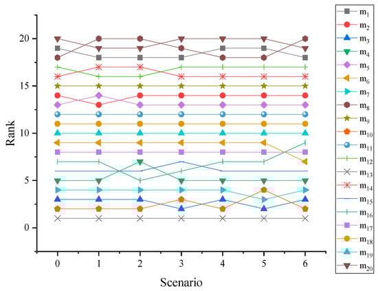 To verify the stability of HMSIT, the sensitivity analysis is adopted. In order to give readers a clear visual sense of the change in ranked results, with respect to small changes in the criteria, we plot Figure 8, based on the data of Table 11. Scenario 0 is the first column of Table 11, scenario 1 is the second column of Table 11, scenario 2 is the third column of Table 11, and so on.